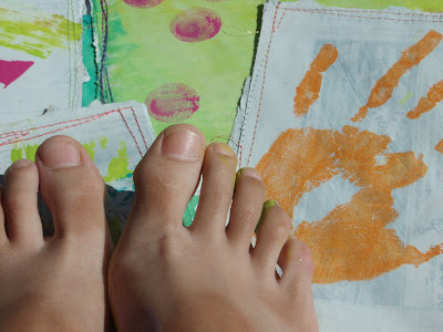 Started an art journal yesterday after seeing the free video demo on donna downey's blog. I enjoyed the process very much. The pages are made out of layers of newspaper. I painted them with gesso and acrylic paints, then thread sketched around the edges with my machine. On one of the pages I did my footprints then later I saw the superhero photo challenge over on shutter sisters...self portrait of your feet. so there I was sitting in the window taking pictures of my feet with paint all over the bottom of them...